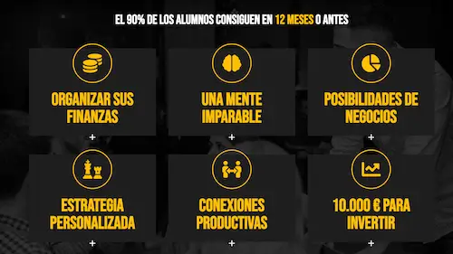 Se trata de una formación sobre mentalidad financiera que promete lo siguiente: conseguir generar 10.000€ en 12 meses.